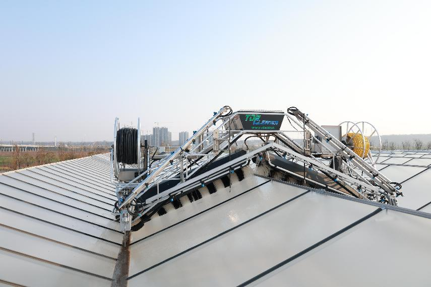 比如,抬头就能看到的自动屋面清洁机,一般每年清洗8—10次,保证温室透光率可达70%以上,在其他因素满足的条件下,增加1%的光照意味着增加1%的产量。