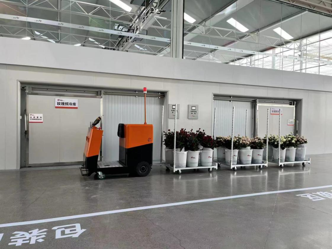 采摘后的花卉处理同样智能化,自动导引运输车如同生产线上的使者,将鲜花快速移送至预冷库。