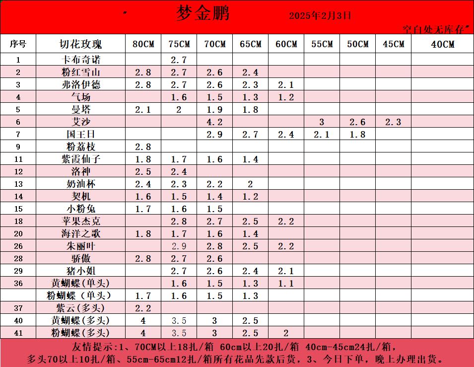 注:小量订购最低多品种混搭满6KG(10扎花左右),装一箱发货