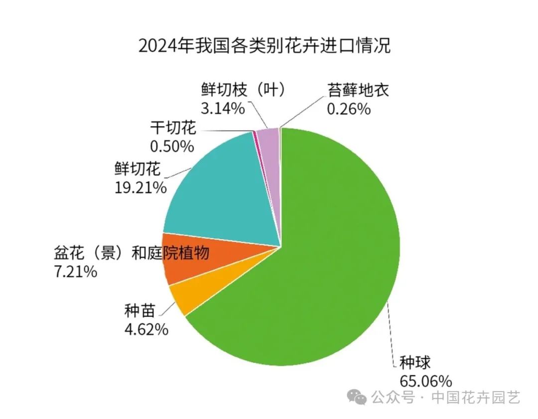 2024年,我国花卉进口总额为26569.13万美元,进口来源广泛,对种球的进口依赖度较大,呈上升趋势。