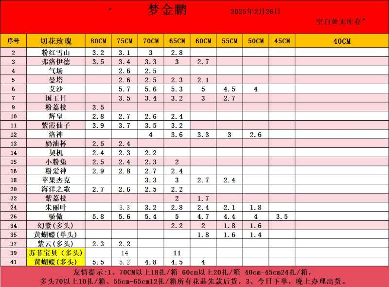 注:小量订购最低多品种混搭满6KG(10扎花左右),装一箱发货