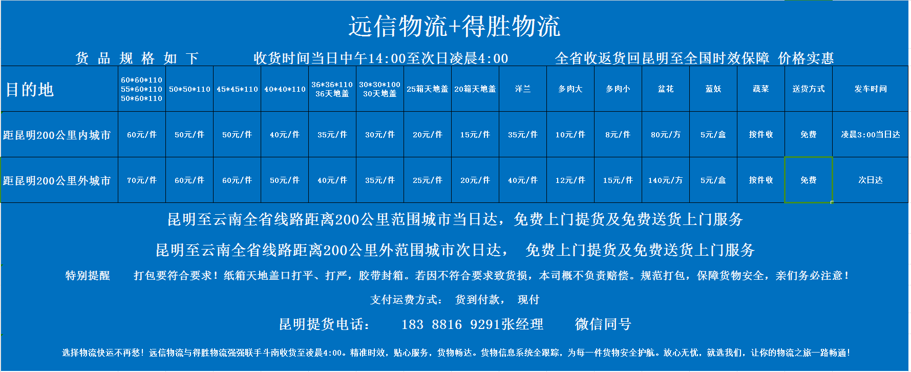 距离昆明 200 公里内的城市,运输时效当日达;200 公里外的城市及县城,次日达!