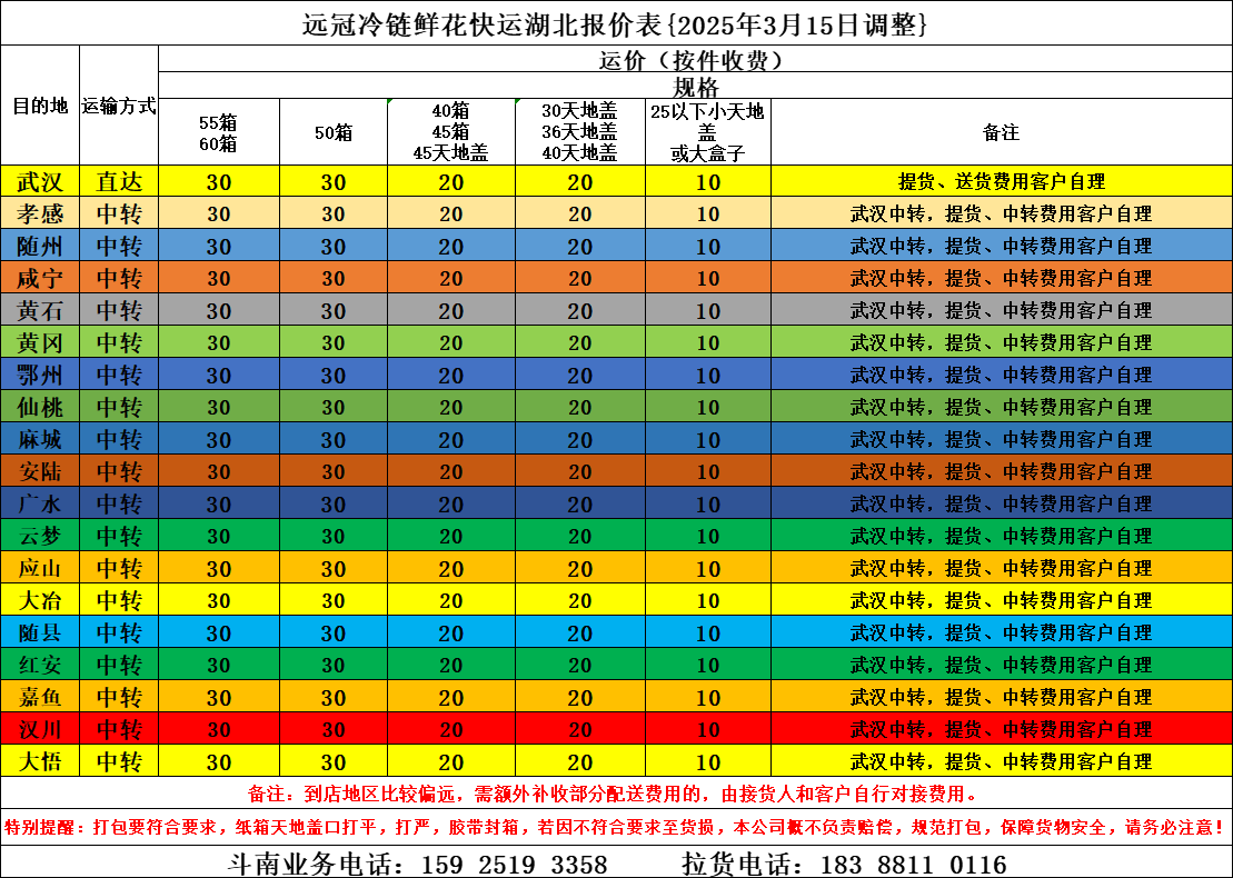 远冠冷链鲜花快运湖北报价表{2025年3月15日调整}
