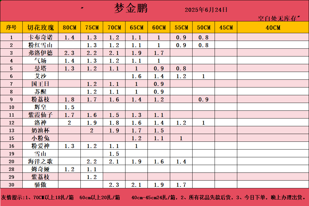 注:小量订购最低多品种混搭满6KG(10扎花左右),装一箱发货