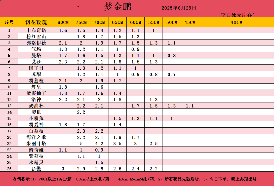注:小量订购最低多品种混搭满6KG(10扎花左右),装一箱发货