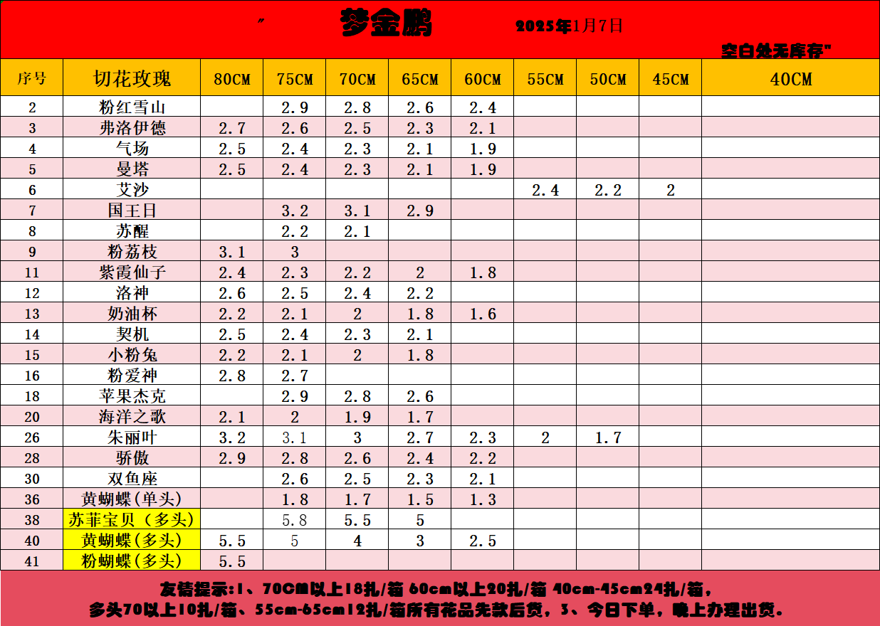 注:小量订购最低多品种混搭满6KG(10扎花左右),装一箱发货